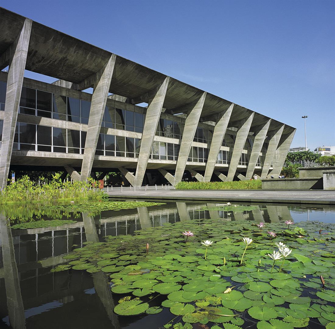 Vista da fachada do MAM com pilotis e lâmina d'água