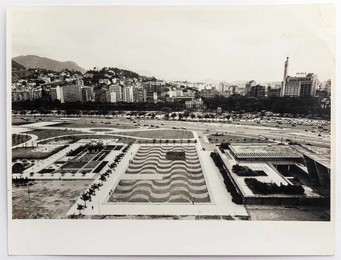 Vista aérea do Aterro do Flamengo a partir da Baía de Guanabara. Em primeiro plano, os jardins recém implantados do Museu de Arte Moderna. Ao fundo, a Praça Paris, o Passeio Público, o Edífício Mesbla e o Palácio Monroe.